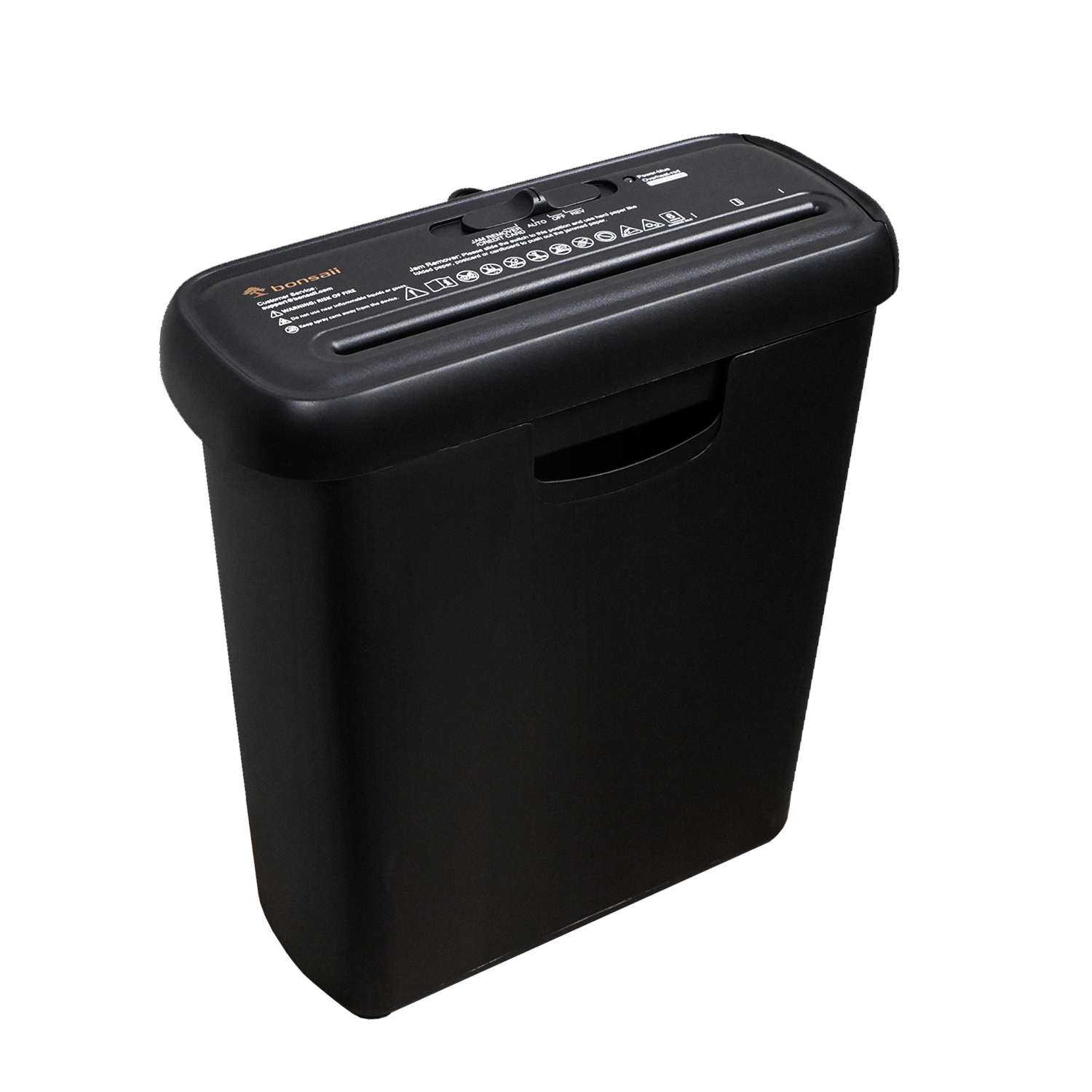 Bonsaii's 6-sheet strip-cut shredder offers efficient document disposal with P-2 level security, ideal for shredding mail, bills, and everyday paperwork. Its minimal design (5.9" W x 12.8" D x 4.7" H) operates without a separate basket, making it perfect for desks, shelves, or small spaces. Weighing only 3 lbs, it’s easy to move around the home or office. This portable shredder features smart overheat protection, automatically pausing during extended use and resuming once cooled. With a 2-minute ON/20-minute OFF cycle, it ensures reliable, long-term performance. Shreds fall directly into the integrated collection area for quick and easy emptying.