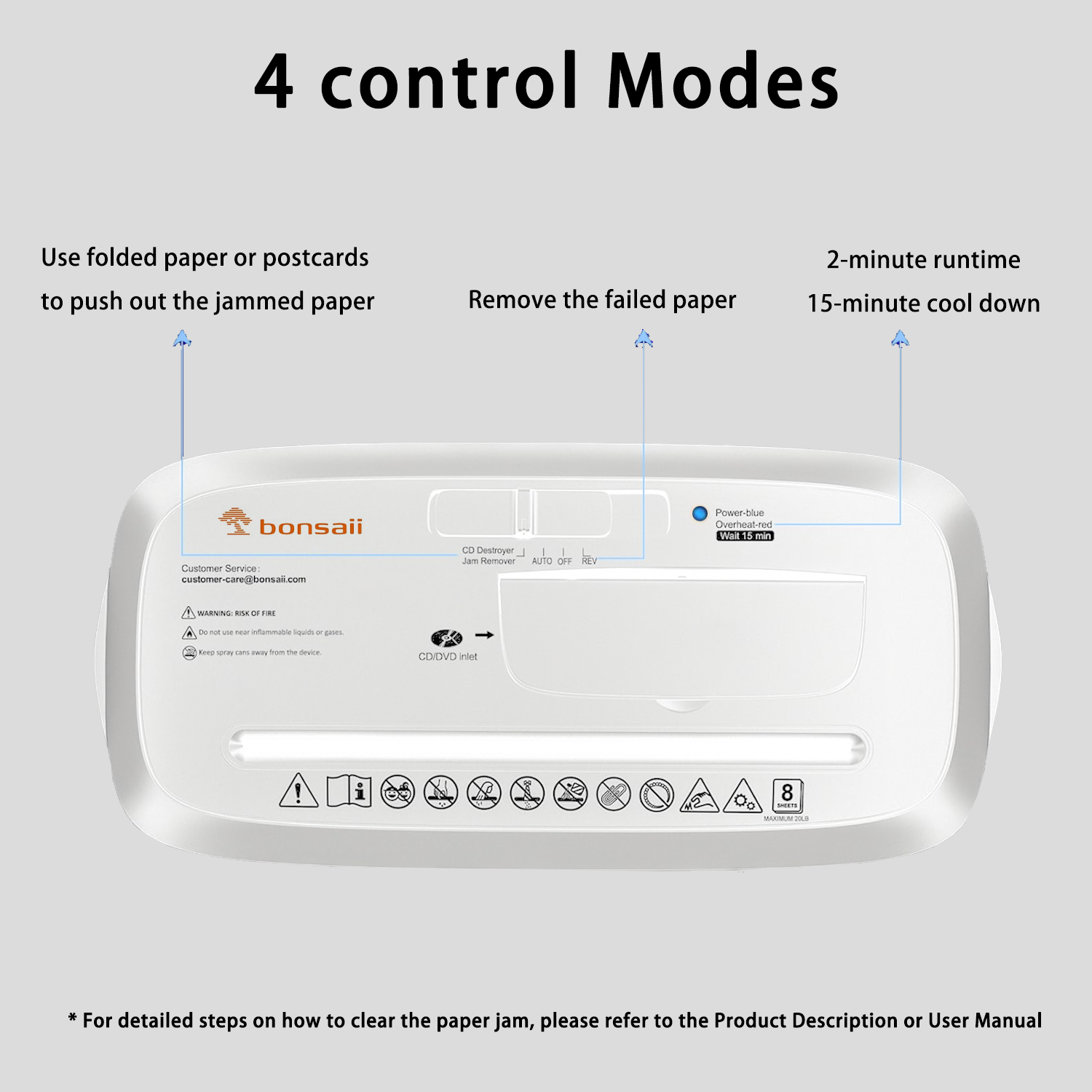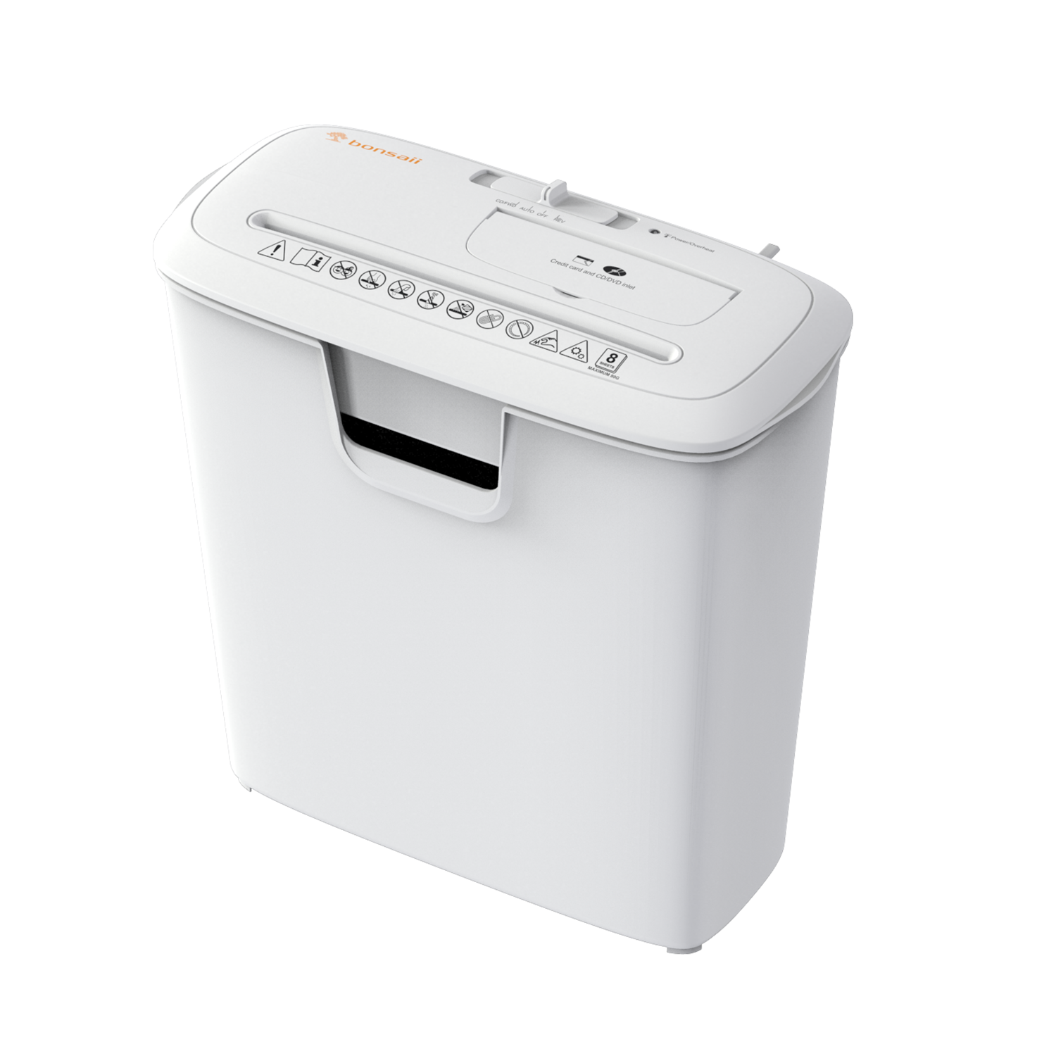 Bonsaii 8-sheet home paper shredder also shreds credit cards, CDs, DVDs, and documents into 15/64" confetti pieces for reliable privacy protection. It runs continuously for 2 minutes before a 15-minute cool-down, with an overheat LED indicator for added safety. Designed for ease of use, it includes a safe start mode and manual reverse—press the FWD button to clear paper jams quickly. The 3.4-gallon waste bin is perfect for everyday use in home or family offices. Note: Do not use aerosol products near the shredder.