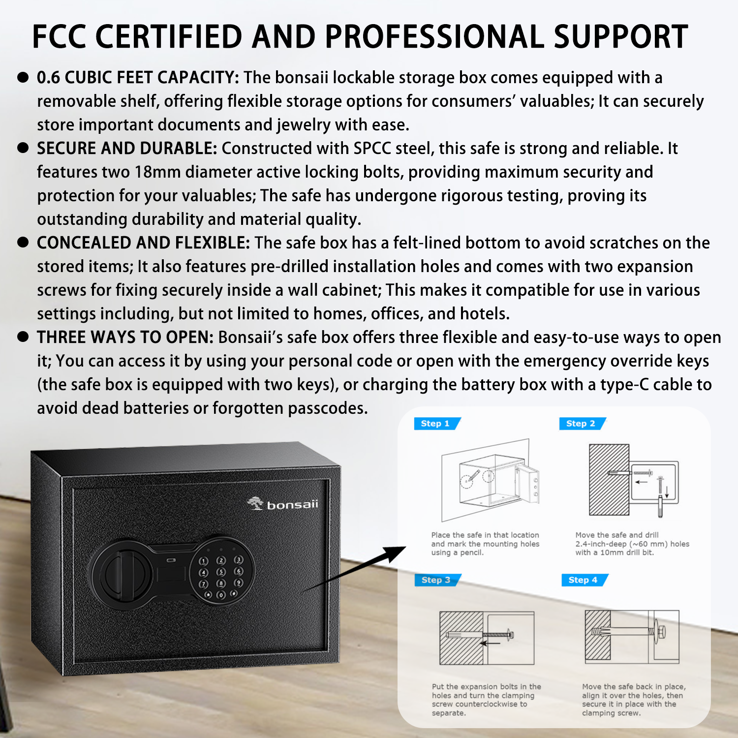 Bonsaii Safe, 0.6 Cubic Safe Box with Electronic Keypad, Removable Shelf, for Valuables Jewelry and Documents in Home, Hotel, or Business, 9.84" x 13.78" x 9.84" Inches, SF002