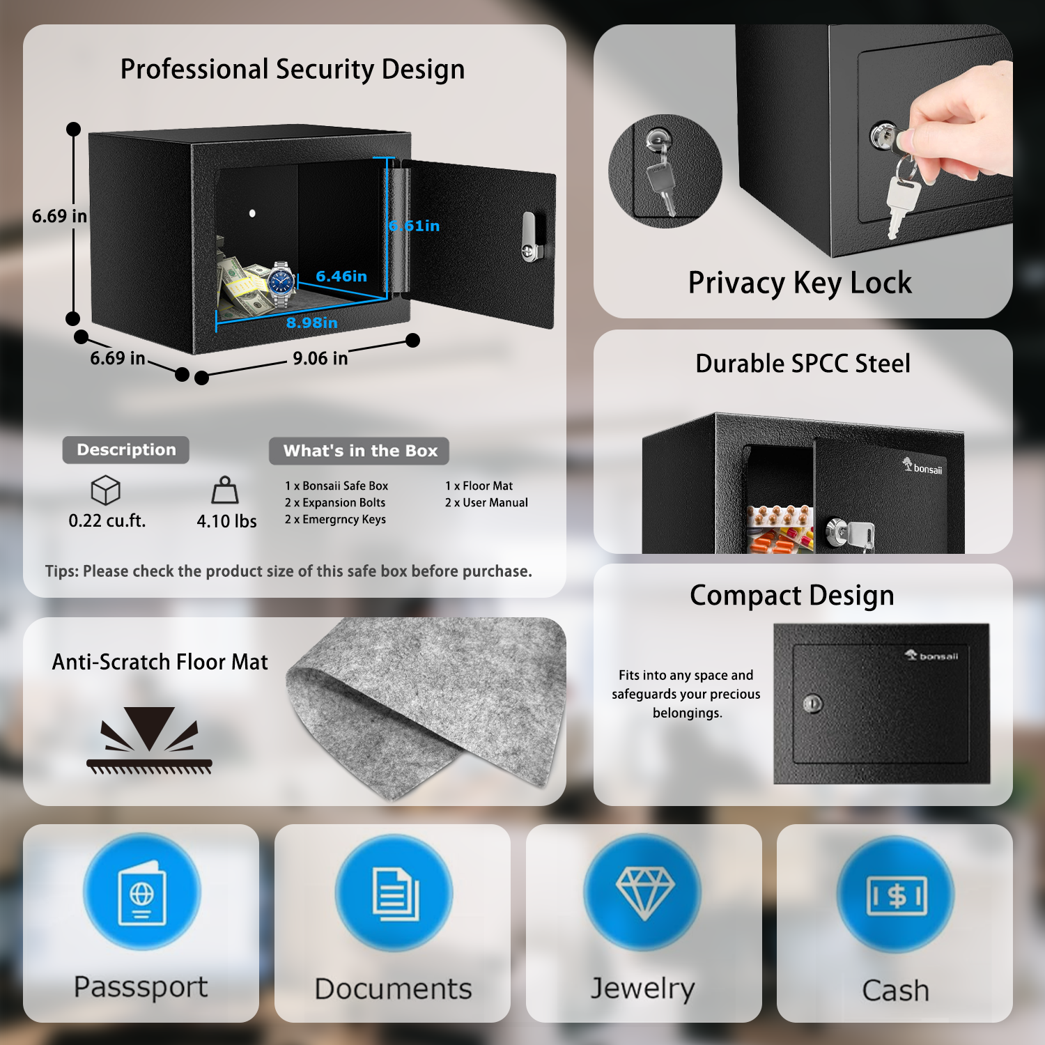 Bonsaii Safe Box with Key Lock, Steel Security Lock Box, 0.23 Cubic Feet, 9.06" W x 6.69" D x 6.69" H, Small Hidden Safe for Cash Jewelry
