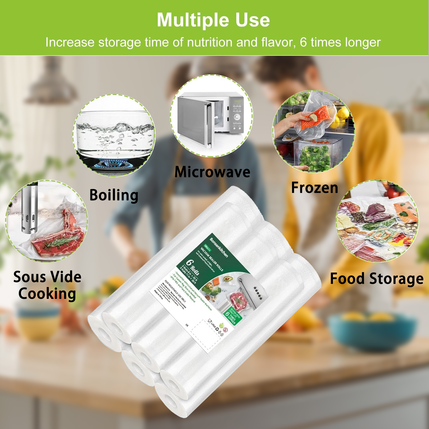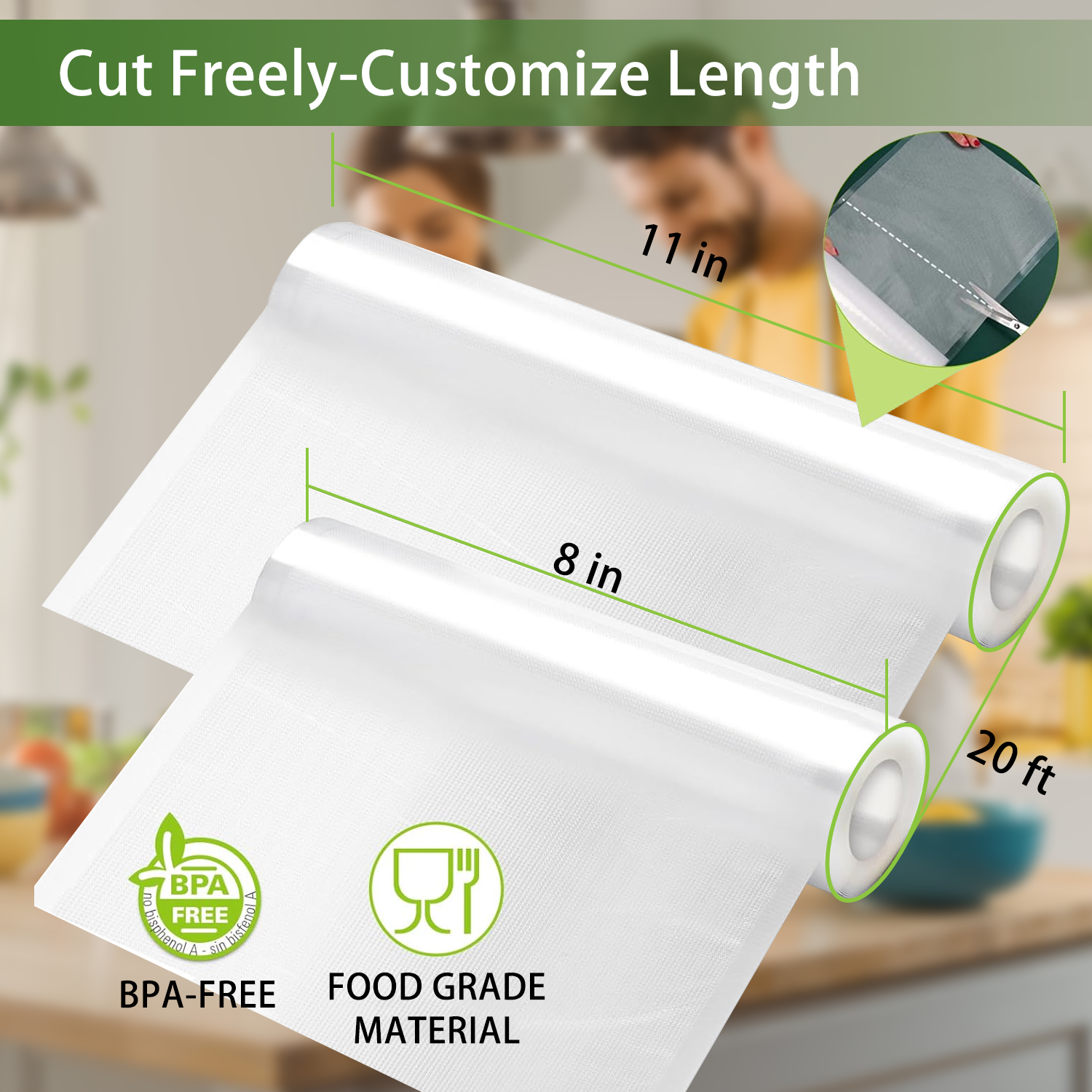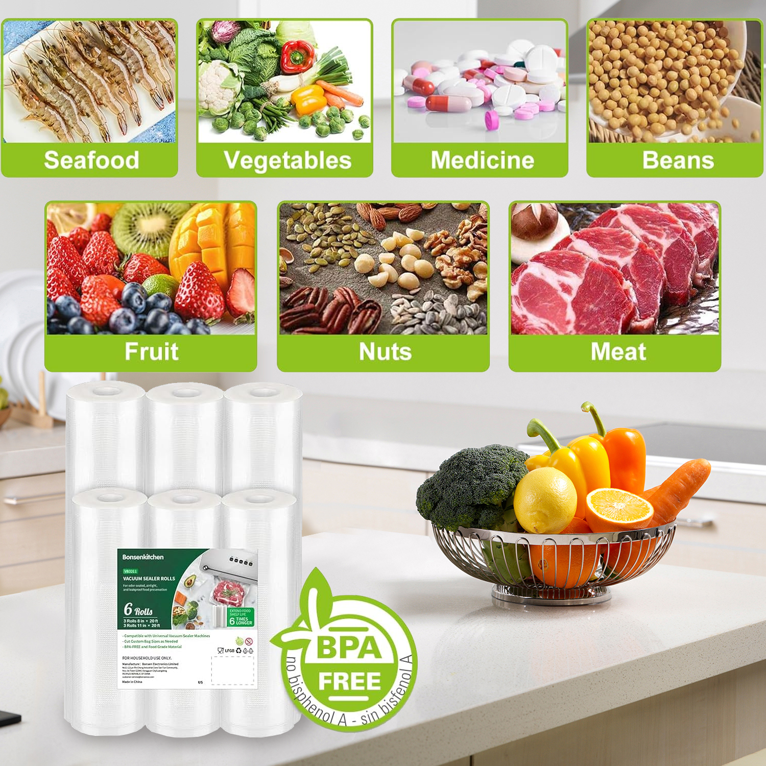 Bonsenkitchen Vacuum Sealer Rolls Bags, 6 Pack 3 Rolls 11" x 20' + 3 Rolls 8" x 20' Commercial Grade BPA Free Bag Rolls, Durable Customized Size Food Vac Bags for Storage and Sous Vide Cooking