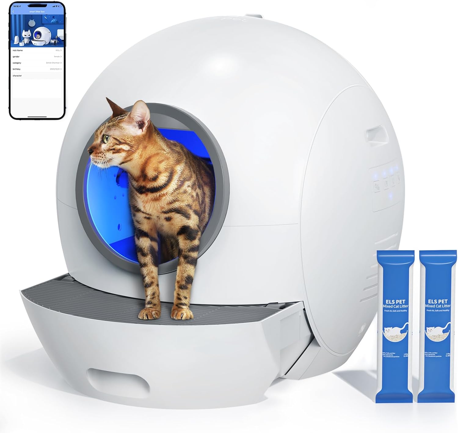 ELS PET Self Cleaning Cat Litter Box with 2 Pack Litter for Multiple Cats,Cat Litter Box Automatic Cleaning App Control/Smart Monitor/Odor-Removal Design, Automatic Litter Box Hand Free- White