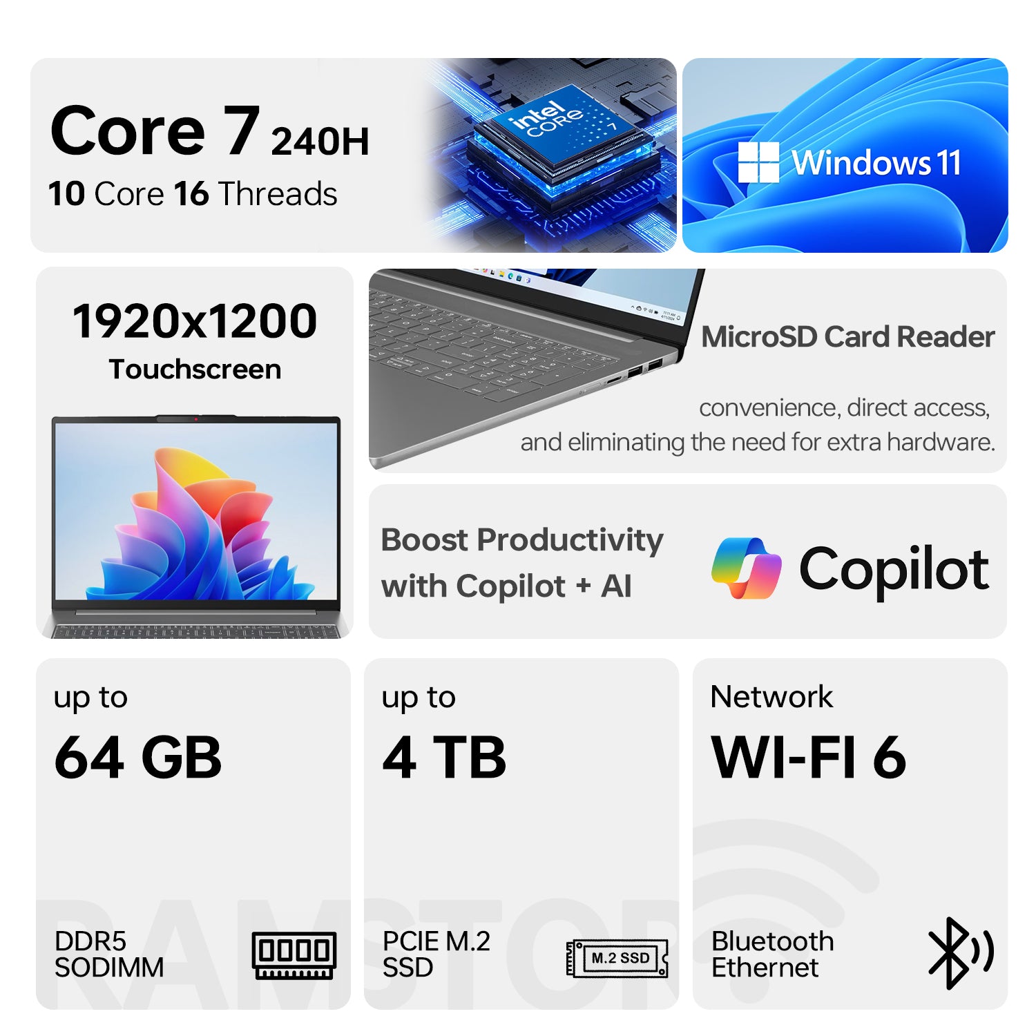 Lenovo IdeaPad Slim 5 Gen 10 Premium Traditional Laptop FEATURES: 16" WUXGA 1920x1200 Touchscreen 60Hz, Intel Core 7 240H, Intel Integrated Graphics, 16GB DDR5 SODIMM, 512GB PCIe M.2 SSD, Wi-Fi 6, Windows 11 Home